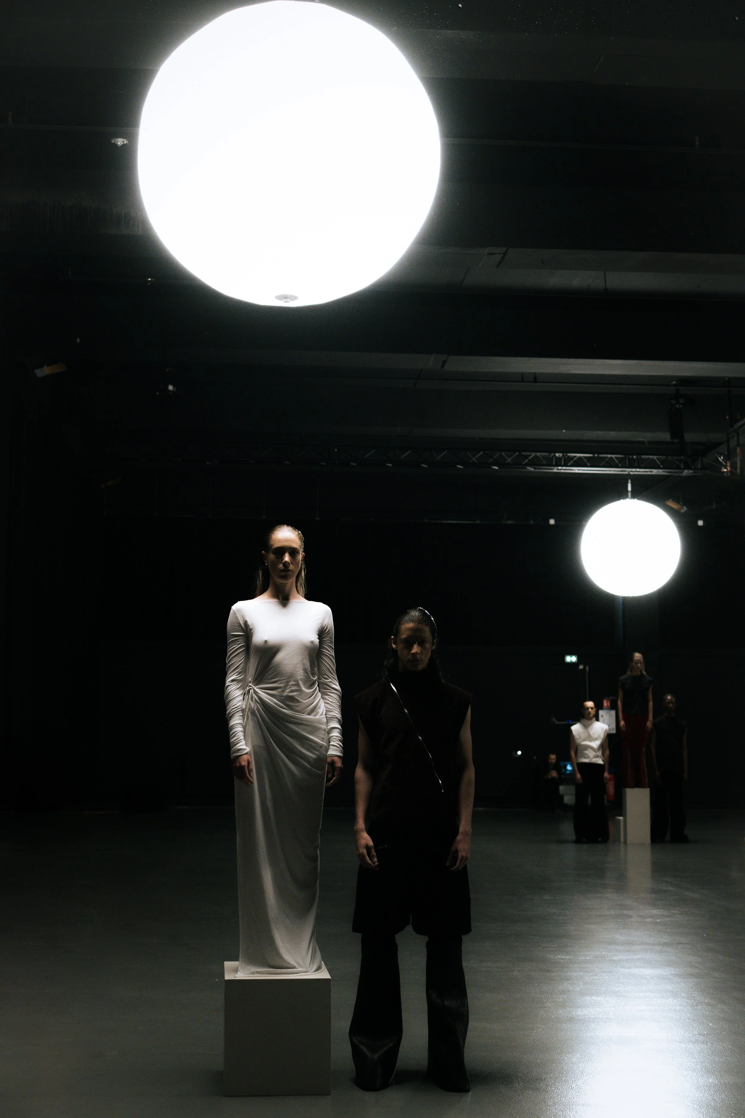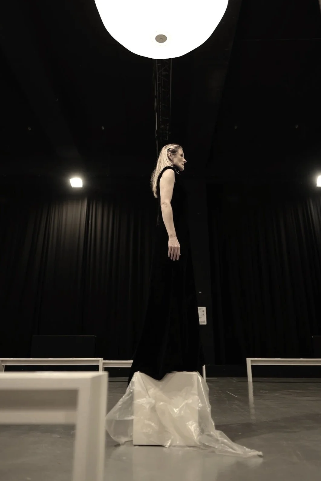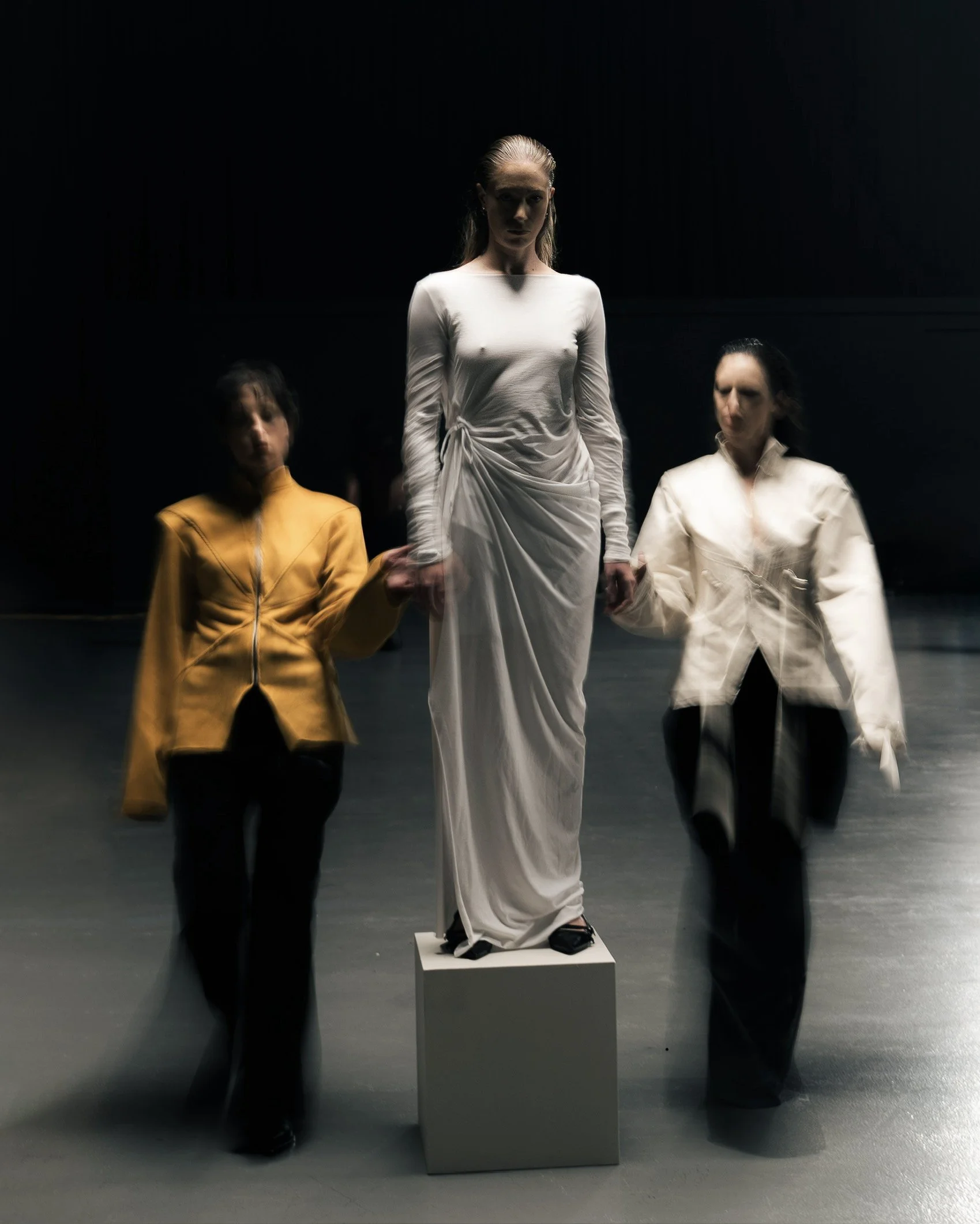 Une grande pièce vide, un sol froid, des cubes gris. C’est dans ce décor brut que des sonorités industrielles marquent le début de notre histoire. Des hommes entrent, amenant dans leur pas des modèles féminins. Celles-ci, se sentant escortées en sécurité, suivent silencieusement. Elles montent même sur le cube où elles sont invitées à être exposées. Elles comprennent par la suite que cette galanterie n’était qu’une façon de les posséder. Debout, regards baissés sur leur piédestal, elles ont fait l’erreur de tendre la main à un homme. Prenant cela comme un geste d’approbation, sans un regard, ni un sourire, les mains masculines parcourent les corps de leur trophée. Lentement, sans violence, de manière habituelle. Sauf que ce qui change cette fois-ci, c’est la colère des victimes. Saisissant chacune le poignet de leur agresseur, brandissant leurs mains sales vers le ciel, elles relèvent la tête vers le public. Cette masse dense qui n’a pas réagi face à ces agressions banalisées.